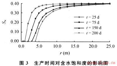 圖3為不同時間含水飽和度隨徑向距離的變化關系曲線(產(chǎn)量為5×104m3/d)。顯示越靠近井筒水相蒸發(fā)越明顯,在近井區(qū)(距井筒的徑向距離小于5m),儲層含水飽和度甚至可以降低到零,同時隨著生產(chǎn)時間的延長,發(fā)生水相蒸發(fā)區(qū)域逐漸向從井筒向地層擴展,但當r超過10m之后水相蒸發(fā)引起含水飽和度降低的作用迅速降低。