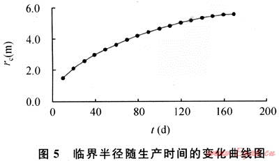計算的臨界半徑隨時間推移曲線如圖5。表明生產(chǎn)時間越長臨界半徑越大,水相蒸發(fā)的影響范圍越深,但是當生產(chǎn)時間超過一定值后(120d),臨界半徑趨于定值,水相蒸發(fā)作用逐漸變緩。