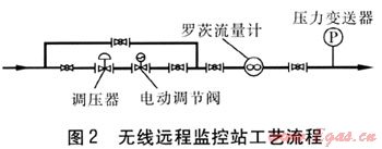 無線遠程監(jiān)控站是在原有的區(qū)域中-低壓調(diào)壓站的基礎(chǔ)上,通過工藝改造增設(shè)羅茨流量計、壓力變送器、電動調(diào)節(jié)閥、無線數(shù)據(jù)采集器(RTU)、后備電源以及無線數(shù)傳Modem構(gòu)成。無線遠程監(jiān)控站工藝流程見圖2。無線數(shù)據(jù)采集器是一種具有采集、處理功能的自動化設(shè)備,專門針對低功耗、無人值守站而設(shè)計,與流量計、壓力傳感器、電動閥門上的數(shù)據(jù)通信接口相連接,按內(nèi)置程序采集數(shù)據(jù)后,執(zhí)行操作指令上傳數(shù)據(jù),由無線數(shù)傳Modem接收信號并解碼壓縮后將信號傳回監(jiān)控中心的工控機。在后備電源的支持下,能夠保證系統(tǒng)在斷電的情況下正常運行48h。