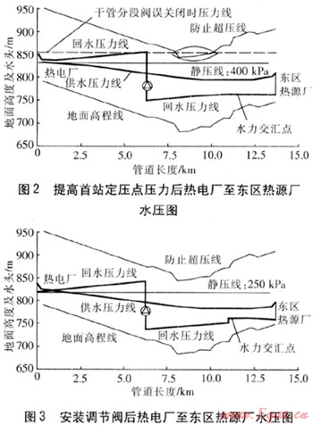 方法二:在水力交匯點熱電廠一側(cè)的回水管道上安裝調(diào)節(jié)閥,安裝調(diào)節(jié)閥后水壓圖見圖3。