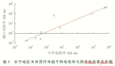 筆者將長寧B井筇竹寺組9個(gè)樣品點(diǎn)的井下測(cè)井電阻率與干樣電阻率進(jìn)行對(duì)比發(fā)現(xiàn),樣品點(diǎn)的測(cè)井電阻率為0.177~457.93W·m,較干樣電阻率整體低2~4個(gè)數(shù)量級(jí)(表1),但與后者具有顯著的正相關(guān)性,測(cè)井電阻率在2W·m以下則對(duì)應(yīng)的干樣電阻率小于100W·m(圖3)。另外,9個(gè)樣品點(diǎn)的測(cè)井電阻率與TOC同樣具有顯著的負(fù)相關(guān)性,在1860.96~1886.40m(富有機(jī)質(zhì)頁巖段)呈現(xiàn)超低電阻特征(電阻率介于0.177~1.347W·m)(表1)。這表明,長寧筇竹寺組井下導(dǎo)電物質(zhì)主要為有機(jī)質(zhì)和頁巖孔縫中地層水,其中擁有高礦化度的地層水是導(dǎo)致測(cè)井電阻率整體低于干樣電阻率的重要介質(zhì)。由于筇竹寺組下段為深水陸棚沉積,地層水物理化學(xué)性質(zhì)在整個(gè)層段總體穩(wěn)定,而有機(jī)質(zhì)豐度差異較大,僅在底部高伽馬段(192~615 API)較高,這表明長寧筇竹寺組底部出現(xiàn)的異常低電阻測(cè)井響應(yīng)則主要是碳化后的有機(jī)質(zhì)導(dǎo)電所致??梢?,利用極高成熟度、富有機(jī)質(zhì)頁巖的超低電阻測(cè)井響應(yīng)特征(電阻率小于2W·m)和干巖樣低電阻特征(電阻率小于100W·m),均可以直觀判斷有機(jī)質(zhì)的碳化程度,進(jìn)而評(píng)價(jià)烴源巖的質(zhì)量。