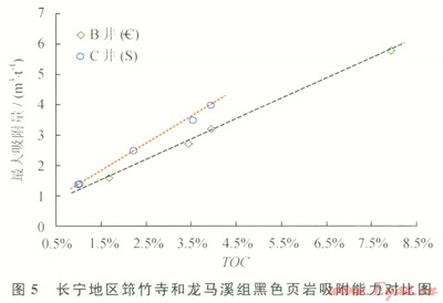 筆者從長寧B井筇竹寺組和C井龍馬溪組分別采集超低電阻頁巖樣品4個(gè)(測(cè)井電阻率介于0.11~1.50W·m,TOC介于1.68%~7.93%)和中高電阻率頁巖樣品5個(gè)(測(cè)井電阻率介于22.6~45.9W·m,TOC介于0.99%~3.95%),并委托中國石油勘探開發(fā)研究院廊坊分院開展高溫高壓等溫吸附實(shí)驗(yàn)。實(shí)驗(yàn)儀器為ISO300型等溫吸附儀,設(shè)置實(shí)驗(yàn)溫度70℃、最大壓力20.22MPa、氣體介質(zhì)為甲烷,保證溫壓條件與井下基本相當(dāng)。實(shí)驗(yàn)結(jié)果顯示:2套地層頁巖樣品的最大吸附量分別為龍馬溪組1.38~3.97m3/t、筇竹寺組1.61~5.8m3/t,與TOC均呈線性正相關(guān)性(圖5);在有機(jī)質(zhì)類型相似(兩者均為腐泥偏腐泥混合型)和有機(jī)質(zhì)豐度(TOC)相同條件下,龍馬溪組中高電阻頁巖的吸附能力明顯高于筇竹寺組超低電阻頁巖,前者為后者的1.2~1.25倍。這表明,在高過成熟階段,隨著有機(jī)質(zhì)碳化程度的增強(qiáng),富有機(jī)質(zhì)頁巖對(duì)天然氣的吸附能力降低。