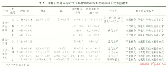 目前,與長寧B井具有相似電性特征的鉆井還有位于隆昌—瀘州、長寧—鎮(zhèn)雄—大方地區(qū)的G、B、H、1、J等5口井(表2、圖l),富有機(jī)質(zhì)頁巖測(cè)井電阻率介于0.1~2.0W·m,平均為0.5~0.8W·m,鉆探均未獲氣,均顯示有機(jī)質(zhì)出現(xiàn)嚴(yán)重碳化現(xiàn)象。