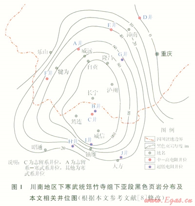對(duì)筇竹寺組的勘探和研究程度遠(yuǎn)不及龍馬溪組,所鉆的頁巖氣評(píng)價(jià)井僅4口(編號(hào)A、B、H、I),主要分布在川滇的威遠(yuǎn)、長寧和鎮(zhèn)雄地區(qū),其他揭示寒武系頁巖的鉆井(編號(hào)D、E、F、G、J)皆為常規(guī)油氣勘探評(píng)價(jià)井(圖1)。鑒于烴源巖碳化呵能導(dǎo)致電測(cè)曲線出現(xiàn)低—超低電阻響應(yīng)特征,筆者以筇竹寺組頁巖鉆井巖心、測(cè)井和分析測(cè)試資料為基礎(chǔ),通過對(duì)富有機(jī)質(zhì)頁巖干樣開展電阻率實(shí)驗(yàn)測(cè)試以獲得有機(jī)質(zhì)碳化的直接證據(jù),并以此對(duì)井下電阻率測(cè)井?dāng)?shù)據(jù)進(jìn)行標(biāo)定,進(jìn)而利用測(cè)井電阻率響應(yīng)對(duì)川南不同地區(qū)筇竹寺組的有機(jī)質(zhì)碳化現(xiàn)象進(jìn)行表征;同時(shí)結(jié)合與龍馬溪組電性、巖相、地球化學(xué)、吸附能力等相關(guān)資料的對(duì)比分析,探討不同程度的有機(jī)質(zhì)碳化現(xiàn)象對(duì)頁巖氣賦存條件的影響,以探尋極高成熟度海相頁巖氣地質(zhì)評(píng)價(jià)的新途徑,并據(jù)此為筇竹寺組頁巖氣資源戰(zhàn)略選區(qū)提供地質(zhì)依據(jù)。
