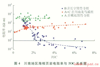 1)有效生氣窗內(nèi)(即有機(jī)質(zhì)未出現(xiàn)碳化階段)電性特征正常,即:電阻率與有機(jī)質(zhì)豐度基本呈正相關(guān),測(cè)井電阻率值一般高于20W·m,如川南龍馬溪組。