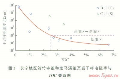 富有機(jī)質(zhì)頁巖為硅質(zhì)頁巖、碳質(zhì)頁巖和粉砂質(zhì)頁巖組合,與龍馬溪組在巖相、巖石礦物組成和有機(jī)質(zhì)豐度等方面相近[8,18,21],因此兩者的電性特征應(yīng)該具有可對(duì)比性,且能反映有機(jī)質(zhì)成熟度的差異。與龍馬溪組電性特征相比,B井測(cè)井響應(yīng)為低超低電阻特征(一般低于1W·m),電阻率與有機(jī)質(zhì)豐度關(guān)系呈明顯負(fù)相關(guān)性(出現(xiàn)反轉(zhuǎn)),即電阻率隨TOC增大而降低(圖4)。前面論述已證實(shí)其有機(jī)質(zhì)已出現(xiàn)嚴(yán)重碳化現(xiàn)象。根據(jù)鉆探和地球化學(xué)分析結(jié)果,B井筇竹寺組未獲氣顯示,頁巖殘余有機(jī)質(zhì)生烴潛量介于0.02~0.04mg/g,氫指數(shù)HI介于1~2mg/g。這表明,長寧筇竹寺組總體已處于生氣衰竭的極高成熟階段,生氣潛力較龍馬溪組差。