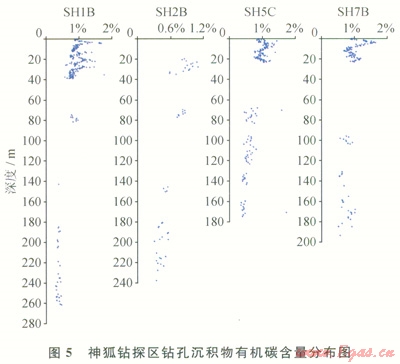 在南海北部陸坡淺表層沉積物有機質(zhì)中正構(gòu)烷烴基本為雙峰形,表現(xiàn)為海相浮游動物、陸源高等植物混合母源特征。神狐鉆孑L沉積物有機質(zhì)正烷烴為雙峰形分布特征(圖4)。第一主峰碳數(shù)為C17~C19,代表海相浮游動物和藻類,第二主峰碳數(shù)為C29或C31來源于陸源高等植物。其輕重?zé)N比值C21-/C22+介于0.06~5.73,有機質(zhì)d13C值為-17.3‰~-22.8‰,表明總體上以海相浮游動物和藻類為主,局部存在陸源有機質(zhì)。鉆孔沉積物TOC介于0.29%~1.77%,各鉆孔頂部層段TOC明顯表現(xiàn)出在高值區(qū)振蕩變化特征,并隨深度的增加TOC值逐漸降低,而到一定深度后,TOC基本保持穩(wěn)定(圖5)。這種有機碳系統(tǒng)地向下減少是早期成巖階段有機質(zhì)氧化分解的結(jié)果[17]。由于鉆孔淺部沉積物埋藏時間短,有機質(zhì)消耗較少,TOC與沉積物中原始含量比較接近,平均值達(dá)1.2%;而下部層段的有機碳為經(jīng)過早期成巖階段硫酸鹽還原和微生物發(fā)酵而大量消耗后的穩(wěn)定殘留有機碳,有機碳轉(zhuǎn)化率在30%~61%,大多轉(zhuǎn)化為生物甲烷氣,是形成水合物的主要氣體來源。神狐鉆孔沉積物有機質(zhì)中含有豐富的烷基苯系列化合物,以短鏈的烷基苯同系物優(yōu)勢為特征,含少量對熱演化敏感的較長鏈的烷基苯同系物,表明有機質(zhì)熱演化程度很低。此外,部分樣品中存在重排甾烷和4-甲基甾烷,是典型的微生物作用活動標(biāo)志,這與鉆探證實的水合物主要為微生物氣特征是一致的。