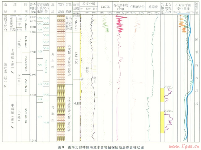 南海北部陸坡水合物主要富集在晚中新世以來的海相沉積物中,分布深度和層位深淺不一。通過對神狐鉆孔巖心分析,根據(jù)生物地層帶對比劃分標(biāo)準(zhǔn)[25],水合物層分布在NNl2-NNl6和NNll帶,分別對應(yīng)為上新統(tǒng)下部和上中新統(tǒng)(圖8)。從區(qū)域性沉積相分析,晚中新世以來南海北部陸坡區(qū)沉積演化具有明顯的繼承性,早期為濱海淺海深海的沉積環(huán)境,后期主要為半深海和深海沉積環(huán)境,陸坡沉積物總體巖性偏細(xì)。但是在臺西南盆地、珠江口盆地白云凹陷以及瓊東南盆地,局部發(fā)育了等深流、濁積扇、滑塌沉積、陸坡水道等沉積體系,由于沉積速率高、沉積物偏粗、有機碳含量較高,有利于水合物富集成藏(圖9)。