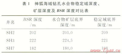 同樣,對神狐海域鉆探區(qū)穩(wěn)定域厚度進(jìn)行了計算,大量鉆探實測數(shù)據(jù)為穩(wěn)定域計算提供了準(zhǔn)確的參數(shù)。鉆探區(qū)熱流值為98.90~62.02mW/m2,在鉆探區(qū)內(nèi)8口先導(dǎo)孔均進(jìn)行了溫度測井和水深測量,在其中5個取心孔不同深度進(jìn)行了原位地層溫度測量,地溫梯度介于67.60~43.65℃/km。水合物甲烷含量超過99%,為I型水合物。計算結(jié)果表明,水合物穩(wěn)定域深度與BSR深度以及測井和取心揭示的水合物底界深度基本相符(表1)。鉆探區(qū)穩(wěn)定域厚度在80~224m,海底熱流變化對穩(wěn)定帶分布制約作用明顯,在SH2、SH3和SH7等3個井位附近,穩(wěn)定域厚度最大,也是熱流值最低的區(qū)域(66~75mW/m2)。