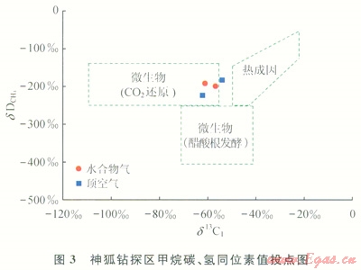 天然氣水合物氣體成因、來源及供給潛力是水合物成藏研究的最基本問題,它決定著水合物形成的物質(zhì)基礎(chǔ)及礦藏的資源潛力。深部的熱成因氣以及由水合物穩(wěn)定帶下部向上運移的生物氣對于形成水合物是必需的[10],不同成因類型的烴類氣體具有不同的形成機理和運聚方式,并影響水合物的成藏和分布。目前世界各地發(fā)現(xiàn)的水合物大多數(shù)由微生物氣生成,僅墨西哥灣、黑海、麥肯齊三角洲等地區(qū)的水合物是由熱解氣或混合氣生成的。因此,生物成因氣在水合物成藏研究中得到了較大的關(guān)注。由于頂空氣代表充填在沉積物孔隙或裂隙中的游離氣,與水合物礦藏氣體的成因關(guān)系密切,近年對南海北部陸坡大量淺表層沉積物(海底以下0~10m)中頂空氣的測試分析結(jié)果表明,頂空氣中的d13C1值介于-102.6‰~-24.0‰,平均值為-71.1‰,C1/(C2+C3)值介于6~84659,dD值介于-180‰~145‰,研究表明氣體來源具有多源性,而且在不同區(qū)域有所差別。東沙海域頂空氣的d13C1值為-102.6‰~-38.2‰,平均值為-78.5‰,是以微生物氣為主的混合氣;西沙海域頂空氣d13C1值為-94.2‰~-71.4‰,平均值為-85.5‰,為微生物氣。從神狐鉆探區(qū)情況看,水合物樣品中的烴類氣體以甲烷為主,甲烷含量高達(dá)99.89%和99.91%,C1/(C2+C3)值分別為911.7和1094,d13C1值為-56.7‰和-60.9‰,dD值為-199﹪和-180‰;2個頂空氣樣品的甲烷含量分別達(dá)99.92%和99.96%,C1/(C2+C1)值分別為1373.5和2447,d13C1值為-62.2‰和-54.1‰,dD值為-225‰和-191‰。神狐鉆探區(qū)呈現(xiàn)以微生物氣為主的混合氣特征[11-12],根據(jù)甲烷碳、氫同位素特征分析,主要為C0。還原型甲烷(圖3),水合物具有自生自儲原地附近運聚的成藏特征[13]。
