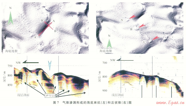 氣煙囪作為超壓流體泄壓的通道,將大量氣體運移到淺部穩(wěn)定域中形成水合物礦藏,部分天然氣滲漏導(dǎo)致在海底形成冷泉噴口、麻坑、匠狀體、碳酸鹽巖匠等并引起海底微地貌的變化,在其周圍分布有大量如菌席、蠕蟲類、雙殼類等組成的以溢出天然氣為營養(yǎng)源的生物組合。例如,在南海東北部陸坡廣泛發(fā)育海底麻坑、丘狀體、自生碳酸鹽巖結(jié)殼等微地貌標(biāo)志(圖7),表明該區(qū)存在著大規(guī)模的海底滲漏現(xiàn)象。2004年中德合作SO177航次在該海域也發(fā)現(xiàn)了大量的結(jié)核狀、結(jié)殼狀或管狀白生碳酸巖鹽和典型的化能生物群落(雙殼類生物和管狀蠕蟲類及厭氧菌席)。