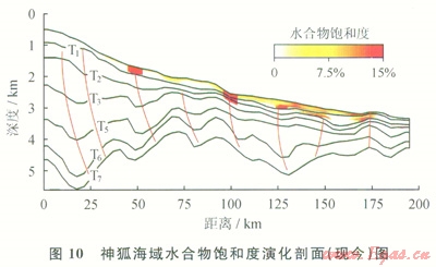 模擬結(jié)果表明,在臺西南盆地水合物主要分布在水深1200~2800m的區(qū)域,海底以下100~400m層段是水合物最富集區(qū)間,飽和度普遍超過6%,水合物呈厚層狀或團(tuán)塊狀展布,局部可超過5%。白云凹陷現(xiàn)今水合物主要分布在水深1000~3200m海域,成帶狀分布富集,斷層控制了水合物的展布[28],一些在第四系中仍然發(fā)育的斷層,其中水合物的飽和度較高,平均含量可超過15%。瓊東南海域水合物主要分布在水深1100~1600m,呈帶狀富集分布,水合物普遍分布較淺,層薄而飽和度不高,厚度最大在100m左右,局部平均含量可超過10%(圖10)。