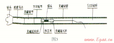 本次采用有線控向系統(tǒng),井下鉆具組合主要由鉆頭、帶彎外殼的螺桿馬達(dá)、泥漿壓力傳感器、控向探棒(兩端帶扶正器)和無(wú)磁鉆鋌組成,其中控向探棒安裝在無(wú)磁鉆鋌內(nèi)部。如圖3: