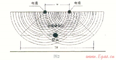 采用人工磁場(chǎng),即在穿越中心線兩側(cè)布設(shè)的閉合線圈,這樣所布線圈不受外部磁場(chǎng)的干擾,可以準(zhǔn)確無(wú)誤的將鉆孔數(shù)據(jù)反映出來(lái),當(dāng)探頭到達(dá)此閉合的線圈區(qū)域內(nèi),接通直流電源產(chǎn)生磁場(chǎng),通過(guò)人工磁場(chǎng)可以測(cè)得穿越軸線的左右偏移和穿越標(biāo)高(如圖2,W為單位寬度)。由于人工磁場(chǎng)受干擾較小,可以提供準(zhǔn)確的管線穿越方位角,從而能夠很好的控制導(dǎo)向孔與設(shè)計(jì)穿越曲線偏移,并能保證穿越曲線的平滑性。