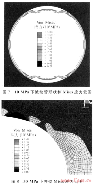 而對(duì)于和波紋管接觸的井壁,只在波紋管與其最先接觸點(diǎn),以及最后接觸的波峰頂點(diǎn)處會(huì)出現(xiàn)較高的Mises應(yīng)力,應(yīng)力最大可達(dá)149MPa,說(shuō)明這些點(diǎn)處最易發(fā)生塑性變形,甚至超出巖壁的承載能力而產(chǎn)生裂紋或破壞。其余波紋管曲率半徑較大的地方,與巖壁接觸時(shí)接觸壓力較小,井壁不易發(fā)生塑性變形和破壞。