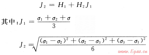 D-P系列屈服準(zhǔn)則是Von-Mises強(qiáng)度準(zhǔn)則的推廣。Von-Mises準(zhǔn)則認(rèn)為,八面體剪應(yīng)力或平面上的剪應(yīng)力分量達(dá)到某一極限值時(shí),材料開(kāi)始屈服,在主應(yīng)力空間Mises準(zhǔn)則是正圓柱面,但巖石具有內(nèi)摩擦性。因此,D-P強(qiáng)度準(zhǔn)則在主應(yīng)力空間是圓錐面[7~8]。其形式為: