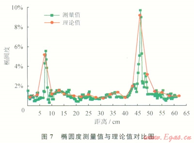 在同一根連續(xù)油管上50mm處和470mm處預制5.1%和9.2%的2個橢圓度缺陷。實驗過程中,每隔30mm選取一點用游標卡尺逐點測量橢圓度作為理論值。