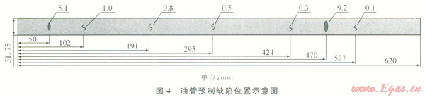 取一根實際作業(yè)使用過,長度為620mm的連續(xù)油管,利用線切割工藝在油管上預制了裂縫深度分別為0.1mm、0.3mm、0.5mm、0.8mm、1mm共5個缺陷(圖4)。