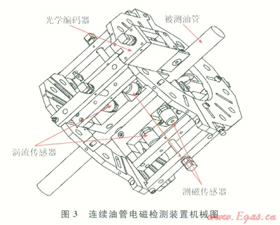 連續(xù)油管電磁檢測系統(tǒng)主要由上位機、檢測單元、數(shù)據(jù)采集和信號分析處理子系統(tǒng)、數(shù)據(jù)通信子系統(tǒng)構成(圖3)。其中,檢測單元主要由磁法檢測儀、橢圓度測量單元、旋轉編碼器定位單元、數(shù)據(jù)采集單元組成。微磁檢測單元中的6個磁通門測磁傳感器和用于橢圓度測量的6個電渦流傳感器都是相互獨立且由相對應的軟件調試、控制,這樣可以保證即使在其中一個傳感器出現(xiàn)問題也不會影響整個系統(tǒng)的正常運行。圖2是用于將測磁傳感器、渦流傳感器、光學編碼器等3種探頭安裝于連續(xù)油管作業(yè)車上實現(xiàn)在線檢測的裝置機械圖。圖3中標出了3種探頭的安裝位置。