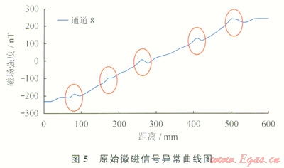 依據(jù)公式(2)可知油管在缺陷處(低磁導率填充)等效磁導率小于本體磁導率,在該處產(chǎn)生一個向上的異常磁信號。同理可知,對于管壁變厚,相當于面積增大,因此會產(chǎn)生一個向下的異常磁信號。根據(jù)缺陷形成的不同特點,管壁腐蝕的異常磁信號變化平緩,而裂紋缺陷的異常磁信號變化劇烈產(chǎn)生類似沖激信號的磁信號。