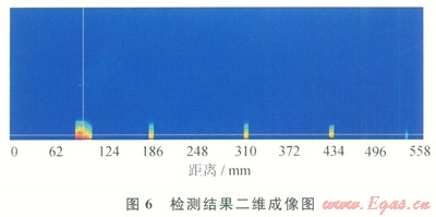 實驗過程中,連續(xù)油管以1m/s的速度(實際作業(yè)時的速度)在機械裝置中抽動。圖5是某通道原始磁信號曲線,可以看出分別在95mm、185mm、298mm、421mm、525mm處出現(xiàn)了向上(因為用線切割預制的缺陷類似裂紋、腐蝕缺陷)的磁信號異常,這就是工件上所預制的5個人工缺陷。圖6檢測結果二維成像圖更加明顯,直觀表示了這些缺陷和大小。圖4表明了5個缺陷在油管上準確位置分別是l02mm、191mm、295mm、424mm、527mm,這與實際檢測的位置相比最大絕對誤差為7mm(第1個缺陷),相對誤差不到1%。