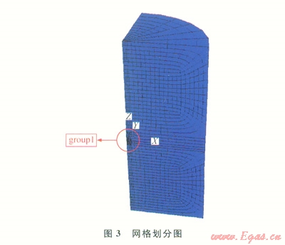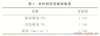 圖3中,1/4圓柱體模擬儲氣庫溶腔周圍的地質(zhì)環(huán)境,其直徑是儲氣庫溶腔模型最大直徑的20倍,在網(wǎng)格中間位置可以看到儲氣庫溶腔輪廓的1/4。在網(wǎng)格劃分時將儲氣庫溶腔網(wǎng)格一起劃分,有助于儲氣庫溶腔的形成。在此網(wǎng)格中,定義了2個組,分別是group1和group2,前者對儲氣庫溶腔進行網(wǎng)格劃分,后者對儲氣庫溶腔周圍地質(zhì)環(huán)境進行網(wǎng)格劃分。選擇采用各向同性彈性模型,其材料特性常數(shù)見表1。