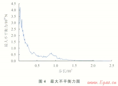 數(shù)值分析采用迭代方法計算,在迭代過程中監(jiān)控一些變量或參數(shù)的變化,以判斷分析結(jié)果是否正確,模型是否與實際相符[6-7]。監(jiān)控模型最大不平衡力,所謂體系最大不平衡力,是指每一個計算循環(huán)中,外力通過網(wǎng)格節(jié)點傳遞分配到體系各節(jié)點時,所有節(jié)點的外力與內(nèi)力之差中的最大值。如圖4~6監(jiān)控了最大不平衡力,并記錄了位移等值線圖和應(yīng)力等值線圖。