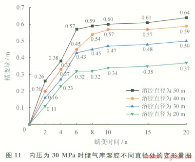 對比分析圖9~11,可以得出:①溶腔不同直徑處變形量隨時間變化規(guī)律比較一致,溶腔直徑為50m處的變形量最大;②蠕變時間為6a時,不同壓力下溶腔不同直徑處變形量曲線均出現(xiàn)一個明顯的轉(zhuǎn)折點。蠕變時間小于6a時,溶腔變形量曲線斜率較大,表明在此時間內(nèi)溶腔變形速率較大,變形比較顯著;蠕變時間大于6a時,溶腔變形量曲線較平緩,溶腔變形量隨時間變化不大;③內(nèi)壓為10MPa時,蠕變20a后,溶腔直徑為50m處變形量為360mm。內(nèi)壓為20MPa時,蠕變20a后,溶腔直徑為50m處變形量為620mm。內(nèi)壓為30MPa時,蠕變20a后,溶腔直徑為50m處變形量為640mm。數(shù)據(jù)表明,溶腔內(nèi)壓小于20MPa時,溶腔變形量隨壓力增大顯著增加;溶腔內(nèi)壓大于20MPa時,溶腔變形量變化不大。