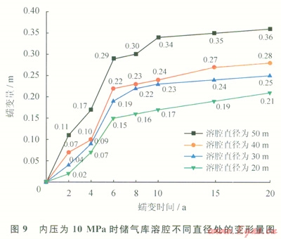 根據(jù)模擬計算所得結(jié)果,可以得到不同壓力下儲氣庫溶腔不同直徑處變形量圖(圖9~11),經(jīng)總結(jié)分析,僅列出具有代表性的分析圖。圖9~11分別表示溶腔內(nèi)壓為10MPa、20MPa、30MPa時,不同蠕變時間鹽穴儲氣庫溶腔不同直徑處的變形量。