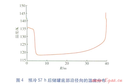 點(diǎn)(0,0)處的溫度隨預(yù)冷時(shí)間的變化見圖3,預(yù)冷57h后儲(chǔ)罐底部沿徑向的溫度分布見圖4。從圖3可以看出,儲(chǔ)罐底部中心(即點(diǎn)(0,0)處)的溫度并不是隨著預(yù)冷過程的進(jìn)行而一直降低的,當(dāng)儲(chǔ)罐底部溫度降低到一定程度后,底部中心出現(xiàn)了溫度不降反升的現(xiàn)象。從圖4也可以看出,底部中心區(qū)域的溫度高于其他位置(除靠近側(cè)壁處)。這是因?yàn)閲娏艿囊旱蔚竭_(dá)儲(chǔ)罐底面后,在底面氣化,產(chǎn)生的氣體無法及時(shí)沿底面向四周擴(kuò)散,積聚在儲(chǔ)罐底部的中心區(qū)域,形成二次回流,二次回流阻礙了儲(chǔ)罐底面與內(nèi)部低溫氣體的對(duì)流換熱。同時(shí),底部的混凝土向內(nèi)部的導(dǎo)熱還在繼續(xù),因此在二次回流區(qū)出現(xiàn)了溫度不降反升的現(xiàn)象。隨著預(yù)冷的繼續(xù),底部混凝土的熱量充分釋放,液滴在儲(chǔ)罐底面處的氣化量減小,產(chǎn)生的新氣體量減少,二次回流區(qū)逐漸被壓縮,底部中心區(qū)域的溫度又重新下降。