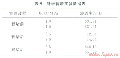 通過試驗數(shù)據(jù)(表8)可以看到,在60℃以上,纖維在鹽酸中能夠很好地降解。暫堵后,纖維能夠顯著降低巖心的滲透率,通過酸化解堵,巖心滲透率能夠完全恢復(fù)(表9)。