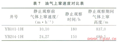 元壩氣田在YB101-1H、YB204-1H井投產(chǎn)中進(jìn)行了試驗,在YB101-1H靜止觀察前測得氣體上竄速度為10.1m/h,靜止觀察180h后,氣體上移距離837m;在YB204-1H井中靜止觀察前測得氣體上竄速度為24.27m/h,靜止觀察150h后,氣體上移距離685.5m,氣體上竄速度均沒有明顯增加,驗證了氣體在壓井液中的運(yùn)行規(guī)律(表7)。實踐證明,通過短起下測油氣上竄速度能夠滿足下完井投產(chǎn)管柱的井控需要。