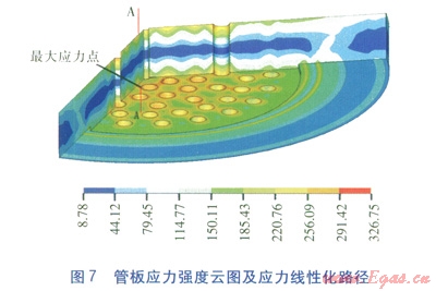 應(yīng)力線性化是ANSYS軟件對運(yùn)算結(jié)果進(jìn)行后處理以讀取計(jì)算數(shù)據(jù)的方法。應(yīng)力線性化路徑的選取原則是:通過應(yīng)力強(qiáng)度最大位置處的節(jié)點(diǎn),并以最短距離橫穿構(gòu)件壁的方向設(shè)定應(yīng)力線性化路徑[4]。軟件系統(tǒng)則在路徑上通過內(nèi)插法自動(dòng)生成插值點(diǎn),并把計(jì)算結(jié)果映射到路徑上。軟件會(huì)自動(dòng)對計(jì)算結(jié)果進(jìn)行應(yīng)力分類,并顯示相應(yīng)路徑下的各類計(jì)算應(yīng)力值?;诒?span lang="EN-US">2強(qiáng)度計(jì)算所需載荷數(shù)據(jù),通過軟件計(jì)算,得到管板應(yīng)力強(qiáng)度分布及應(yīng)力線性化路徑,見圖6、7,圖中數(shù)值為應(yīng)力強(qiáng)度,單位為MPa。