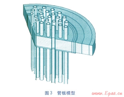 因此,建模時(shí)在理論上換熱管在管板兩側(cè)需要保留的外伸長度應(yīng)大于9.7mm,即可滿足要求。根據(jù)工程實(shí)際情況,該模型取換熱管相對于管板向上外伸長度為140mm,向下外伸長度為300mm(實(shí)際加熱器換熱管相對于管板向上外伸長度為160mm,向下外伸長度為2400mm)。