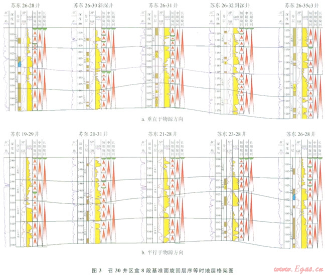 蘇里格地區(qū)盒8段砂體構(gòu)型可分為復(fù)合河道砂體和單一河道砂體,前者被稱(chēng)為疊置河道砂,后者被稱(chēng)為單河道砂。本文以層序地層學(xué)理論為依據(jù),在層序地層界面識(shí)別的基礎(chǔ)上,建立了召30井區(qū)盒8段高分辨率層序地層格架,通過(guò)中期基準(zhǔn)面的對(duì)比識(shí)別出疊置河道砂,進(jìn)而通過(guò)短期基準(zhǔn)面的對(duì)比識(shí)別出單河道砂,并定量刻畫(huà)該地區(qū)盒8段河道帶及河道砂體規(guī)模,建立儲(chǔ)集砂體構(gòu)型,以期為氣田開(kāi)發(fā)過(guò)程中的井距優(yōu)化和天然氣“甜點(diǎn)”的選擇提供依據(jù),提高氣田開(kāi)發(fā)效益。