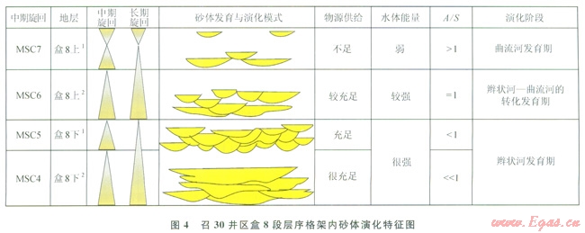 1)蘇里格氣田召30井區(qū)盒8段發(fā)育兩個(gè)長(zhǎng)期基準(zhǔn)面旋回,4個(gè)中期基準(zhǔn)面旋回,12個(gè)短期基準(zhǔn)面旋回及若干超短期基準(zhǔn)面旋回,其中基準(zhǔn)面最高在盒8上亞段沉積初期,最低在盒8上亞段沉積末期。盒8段層序自下而上主要形成于可容納空間小于沉積物供給速率的基準(zhǔn)面緩慢上升和快速下降的地層旋回過(guò)程中,僅保存上升半旋回的向上“變深”非對(duì)稱(chēng)型結(jié)構(gòu)(A型)的中、短期旋回結(jié)構(gòu)類(lèi)型為主,反映出盒8段沉積時(shí)自下而上物源供給逐步穩(wěn)定,水體能量逐漸減弱的過(guò)程,與盒8段自下而上由辮狀河向曲流河轉(zhuǎn)變的這一特征相符。