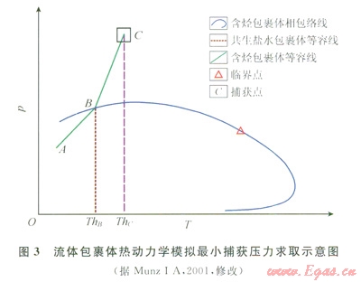 目前古流體壓力值測(cè)定方法有多種[8-18],筆者結(jié)合本地區(qū)油氣成藏的地質(zhì)條件,采用流體包裹體PVT模擬法來(lái)計(jì)算古流體壓力值。如圖3中,ABC線為烴類包裹體或含烴鹽水包裹體等容線,AB段為氣液兩相共存,到B點(diǎn)均一為液相;ThB為含烴鹽水或烴類流體包裹體均一溫度,ThC為同期鹽水包裹體均一溫度。