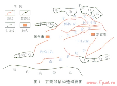 東營(yíng)凹陷是隸屬于渤海灣盆地濟(jì)陽(yáng)坳陷的次一級(jí)負(fù)向構(gòu)造單元,屬于新生代形成的斷陷盆地,呈典型的北斷南超構(gòu)造格局,北部為陡坡構(gòu)造帶(又稱東營(yíng)北帶),中部為洼陷帶和中央隆起帶,南部為緩坡構(gòu)造帶(圖1)。