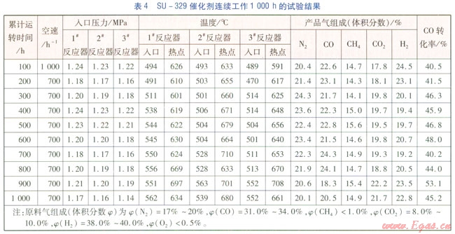 1#反應(yīng)器入口壓力為1.15~1.25MPa,1#反應(yīng)器入口溫度為490~560℃,原料氣中CO體積分?jǐn)?shù)為31%~34%的穩(wěn)定運(yùn)轉(zhuǎn)條件下,SU-329催化劑原料氣的低熱值比為1.17左右,產(chǎn)品氣的低熱值為 連續(xù)工作1000h的試驗(yàn)結(jié)果見表4。