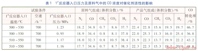 1#反應(yīng)器入口壓力及原料氣中CO的濃度均有一定波動,會影響催化劑的活性,對此進(jìn)行了試驗(yàn),試驗(yàn)條件及結(jié)果見表1。