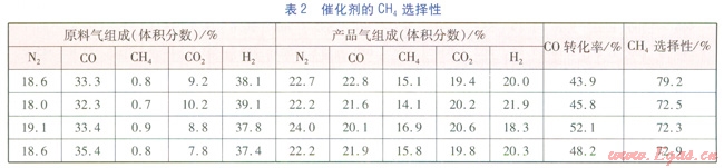 由表2可知,在所選擇的操作條件下,CO轉(zhuǎn)化率為43%~52%,CH。選擇性大于70%??梢?/font>1#反應(yīng)器入口壓力為1.15~1.25MPa,1#反應(yīng)器入口溫度為500~530℃,空速為700h,原料氣中CO體積分?jǐn)?shù)為31%~34%是一種較適宜的操作條件。同時可以看出SU-329催化劑對CO具有變換和甲烷化雙重功能,原料氣中的CO既能和H2通過甲烷化反應(yīng)合成甲烷,同時又能和甲烷化反應(yīng)后生成的H2O通過變換反應(yīng)生成H2和CO2。甲烷化前原料氣中CO。體積分?jǐn)?shù)為9%左右,而甲烷化后產(chǎn)品氣中CO,體積分?jǐn)?shù)增加到20%左右,說明了催化劑對CO具有變換功能。