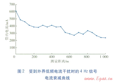 一般情況下,管道內(nèi)的信號(hào)電流應(yīng)該隨著測(cè)量距離的增大而不斷衰減,但是當(dāng)存在外界低頻電流干擾時(shí),4Hz的信號(hào)電流會(huì)出現(xiàn)突然反彈或者波動(dòng)的現(xiàn)象,受到外界低頻電流干擾時(shí)的4Hz信號(hào)電流衰減曲線見圖2[6]。外界干擾的低頻電流會(huì)與檢測(cè)中使用的4Hz低頻信號(hào)電流互相作用,產(chǎn)生疊加或抵消,當(dāng)疊加時(shí),會(huì)出現(xiàn)圖2中信號(hào)電流反彈升高的情況;當(dāng)?shù)窒麜r(shí),會(huì)出現(xiàn)信號(hào)電流驟然變小的情況。無(wú)論是疊加還是抵消,都會(huì)對(duì)防腐層的檢測(cè)結(jié)果產(chǎn)生很大影響,甚至嚴(yán)重失真。