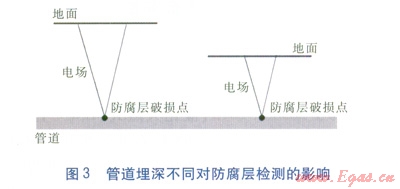 一般地,城鎮(zhèn)燃?xì)夤艿栏魈幝裆畈煌?。不同的管道埋深將?huì)對(duì)防腐層破損點(diǎn)處泄漏電流產(chǎn)生的電場(chǎng)產(chǎn)生很大影響。假設(shè)管道防腐層的破損情況相同、周圍土壤電阻率變化不大,當(dāng)管道埋深較小時(shí),從防腐層破損點(diǎn)向外傳導(dǎo)的電流相對(duì)集中,在地面上檢測(cè)到的電流較大;而當(dāng)管道埋深較大時(shí),在地面上檢測(cè)到的電流較小(見圖3)。