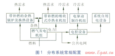 分布系統(tǒng)一般包括動(dòng)力設(shè)備(主要為發(fā)電機(jī)組)、余熱利用設(shè)備(主要為帶補(bǔ)燃的余熱鍋爐、換熱設(shè)備、帶補(bǔ)燃的吸收式冷熱水機(jī)組等)、供配電設(shè)備(主要為電控設(shè)備等)、燃?xì)夤?yīng)設(shè)備、監(jiān)控裝置等,常規(guī)配置見(jiàn)圖1。在實(shí)際設(shè)計(jì)中,應(yīng)根據(jù)發(fā)電機(jī)組特性、用戶需求(熱電比、冷熱負(fù)荷特性)等多方面因素合理配置分布系統(tǒng),以實(shí)現(xiàn)能源的高效經(jīng)濟(jì)利用。