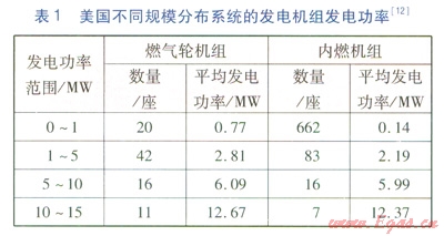 內(nèi)燃機(jī)組是將液體或氣體燃料與空氣混合后,直接輸入氣缸內(nèi)部燃燒并產(chǎn)生動(dòng)力的設(shè)備,是一種將熱能轉(zhuǎn)化為機(jī)械能的熱機(jī),具有體積小、熱效率高、啟動(dòng)性能好等優(yōu)點(diǎn),發(fā)電功率范圍為5~18000kW。美國(guó)不同規(guī)模分布系統(tǒng)的發(fā)電機(jī)組發(fā)電功率見(jiàn)表1[12]。