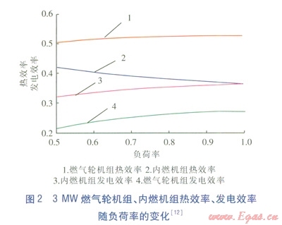 在分布系統(tǒng)中,發(fā)電機(jī)組常運(yùn)行在部分負(fù)荷狀態(tài)下,其變工況特性對(duì)分布系統(tǒng)綜合性能影響較大。以發(fā)電功率均為3MW的燃?xì)廨啓C(jī)組、內(nèi)燃機(jī)組為例,熱效率、發(fā)電效率隨負(fù)荷率的變化見(jiàn)圖2[12]。由圖2可知,隨著負(fù)荷率的降低,兩種發(fā)電機(jī)組的發(fā)電效率均呈現(xiàn)下降趨勢(shì),但內(nèi)燃機(jī)組的發(fā)電效率比燃?xì)廨啓C(jī)組高10%(絕對(duì)值)左右。燃?xì)廨啓C(jī)組的熱效率明顯高于內(nèi)燃機(jī)組,前者的熱效率隨著負(fù)荷率的降低而降低,后者的熱效率隨著負(fù)荷率的降低有上升趨勢(shì)。由以上分析可知,盡管兩種發(fā)電機(jī)組在額定工況下具有大致相同的熱電總效率(熱效率與發(fā)電效率之和),但內(nèi)燃機(jī)組的變工況特性更優(yōu)。