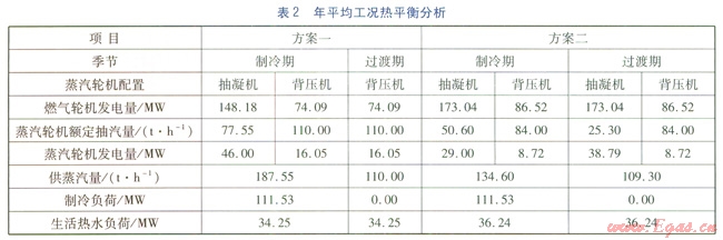 兩種裝機(jī)方案的機(jī)組年平均工況熱平衡分析見表2。由表2可知,兩種方案在制冷期和過渡期均能滿足負(fù)荷需求。兩種裝機(jī)方案的全廠熱經(jīng)濟(jì)性指標(biāo)見表3。
