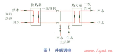 這種方式是目前國(guó)內(nèi)常見(jiàn)的調(diào)峰形式,考慮調(diào)峰熱源的相對(duì)位置及容量大小,又可細(xì)分為裂解調(diào)峰(調(diào)峰熱源與主熱源分別運(yùn)行)和并聯(lián)調(diào)峰(見(jiàn)圖1)。并聯(lián)調(diào)峰是調(diào)峰熱源高溫?zé)崴M(jìn)入換熱器與主熱源一級(jí)管網(wǎng)循環(huán)水進(jìn)行熱交換,使一級(jí)管網(wǎng)循環(huán)水升溫后輸送至各熱力站,與二級(jí)管網(wǎng)換熱。調(diào)峰熱源處于管網(wǎng)前端時(shí),適宜裂解調(diào)峰;調(diào)峰熱源處于管網(wǎng)水力工況薄弱點(diǎn)時(shí)適宜并聯(lián)調(diào)峰,在滿足熱負(fù)荷的前提下,能改善管網(wǎng)末端水力工況。