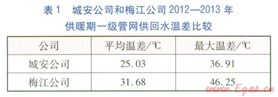 天津市城安熱電有限公司(以下簡(jiǎn)稱城安公司)和天津市梅江供熱公司(以下簡(jiǎn)稱梅江公司)2012—2013年供暖期一級(jí)管網(wǎng)供回水溫差比較見(jiàn)表1。由表1可知,城安公司一級(jí)管網(wǎng)供回水溫差與梅江公司差距較大。