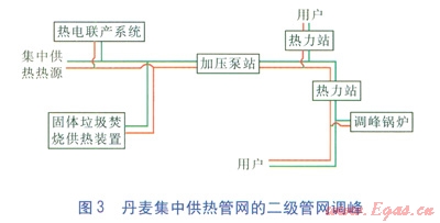 二級(jí)管網(wǎng)調(diào)峰多出現(xiàn)于東歐國(guó)家,比如丹麥集中供熱管網(wǎng)的調(diào)峰鍋爐設(shè)置(見(jiàn)圖3)就很有代表性[1-3]。